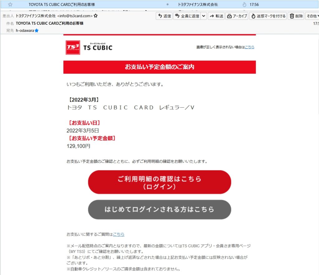 差出人は「info@ts3card.com>」に偽装されていたがリンク先URLが正規のものと異なっていたので気づいた。