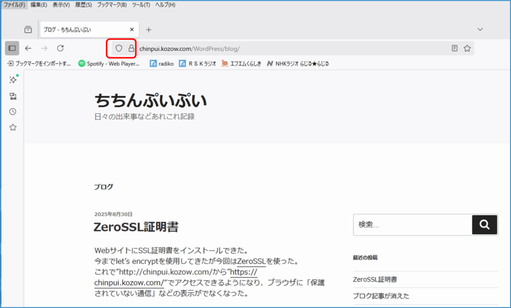 これで”http://chinpui.kozow.com/から”https://chinpui.kozow.com/“でアクセスできるようになり、ブラウザに鍵マークが表示され「保護されていない通信」などの表示がでなくなった。