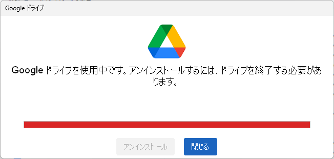 パソコン版のGoogle Driveをインストールして使用中で何らかの理由でアンインストールしようとすると図のように「Googleドライブを使用中です。アンインストールするには、ドライブを終了する必要があります。」と表示されアンインストールできない。