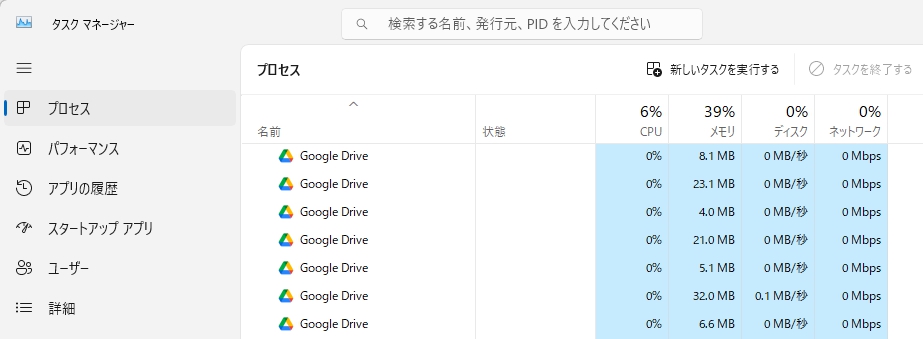 3.バックグラウンドプロセスのなかに「Google Drive」を見つける。