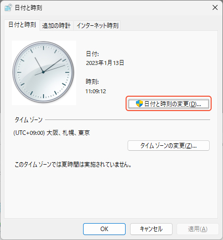1-2-3.「日付と時刻」ダイアログが表示されるので「日付と時刻の変更」をクリック