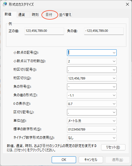 1-2-6.「形式のカスタマイズ」ダイアログが表示されるので「日付タブ」をクリック