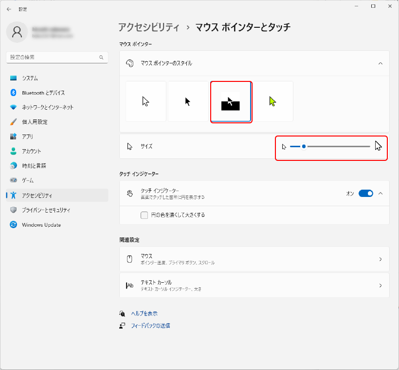 マウスポインターのスタイルを左から3番目の白黒に、サイズをスライドバーでお好みに設定